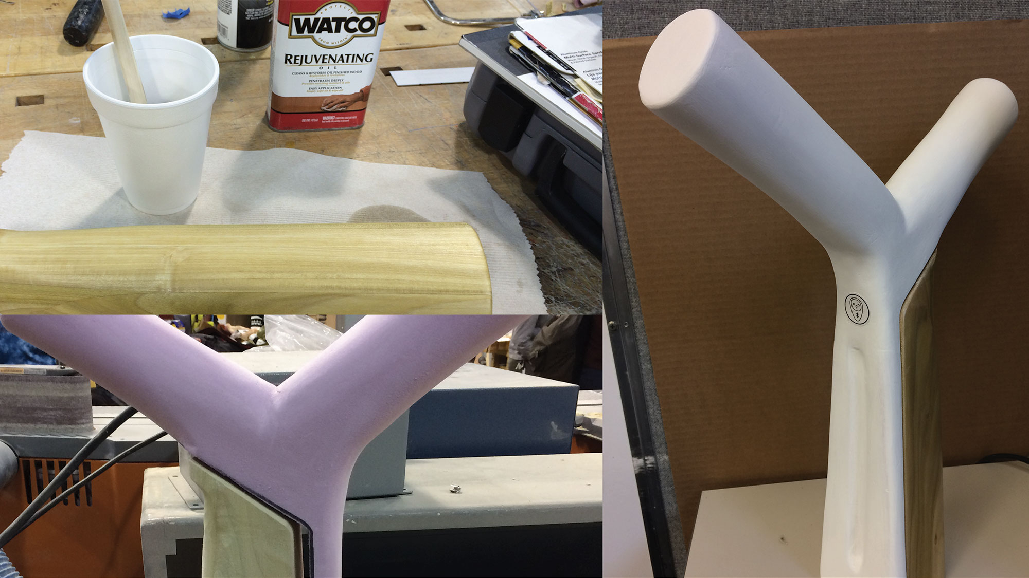 Various techniques were used, such as sculpting and lacquering wood, shaping and painting foam, and printed adhesive labels to denote capacitive buttons and controls.