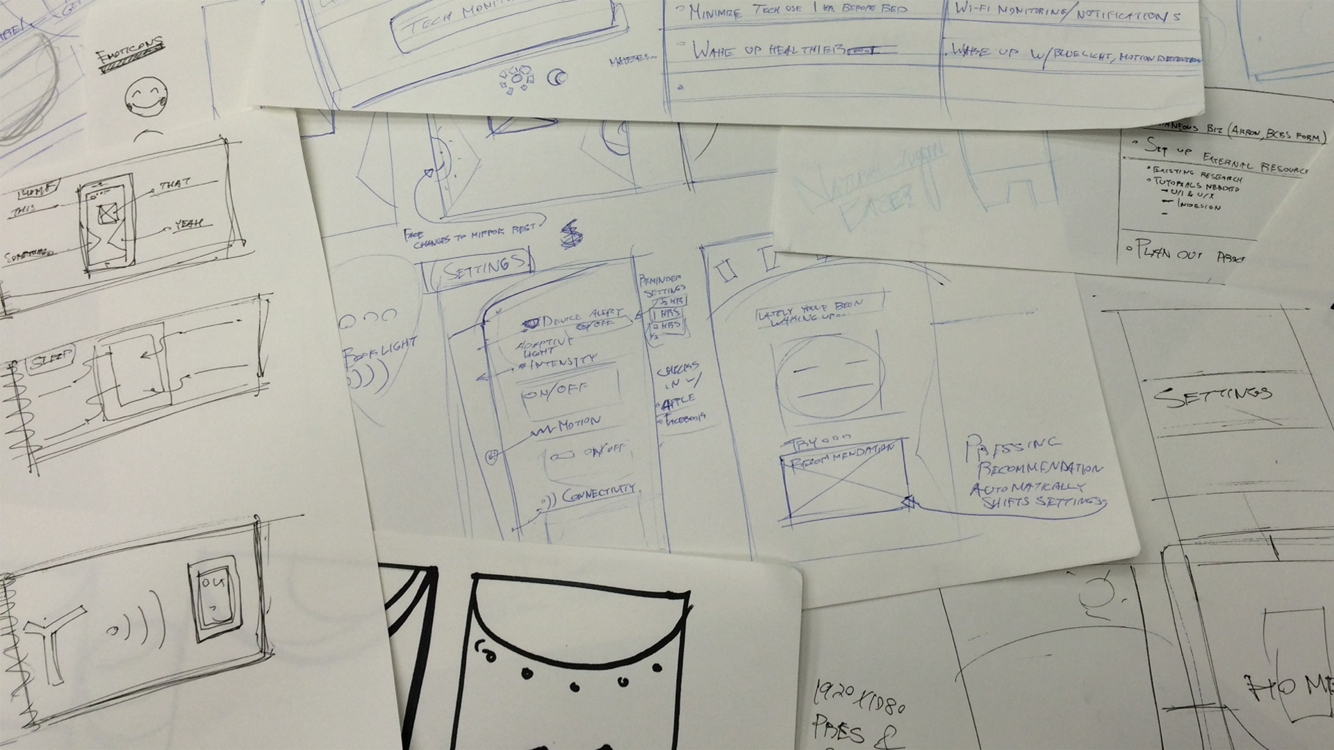 Rapid sketching and ideation again explored exactly how the user might make meaningful adjustments as to how the lamp tracked sleep quality and offered proper lighting, screen-time management, and useful metrics in return.