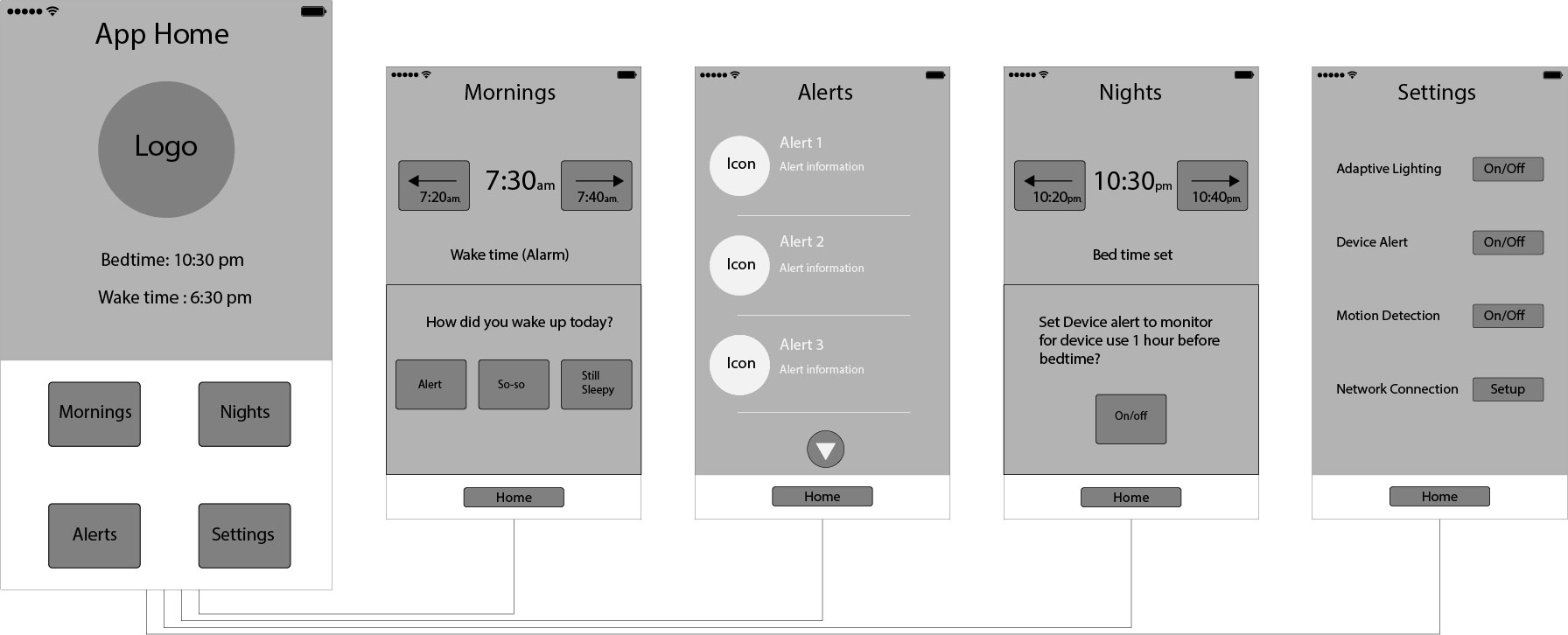 With the goal of correcting the user’s sleeping habits, the amount of controls needed to adjust the smart-lamp’s features and viewing sleep quality feedback necessitated a connected app to be used after waking and obviously outside the bedroom.