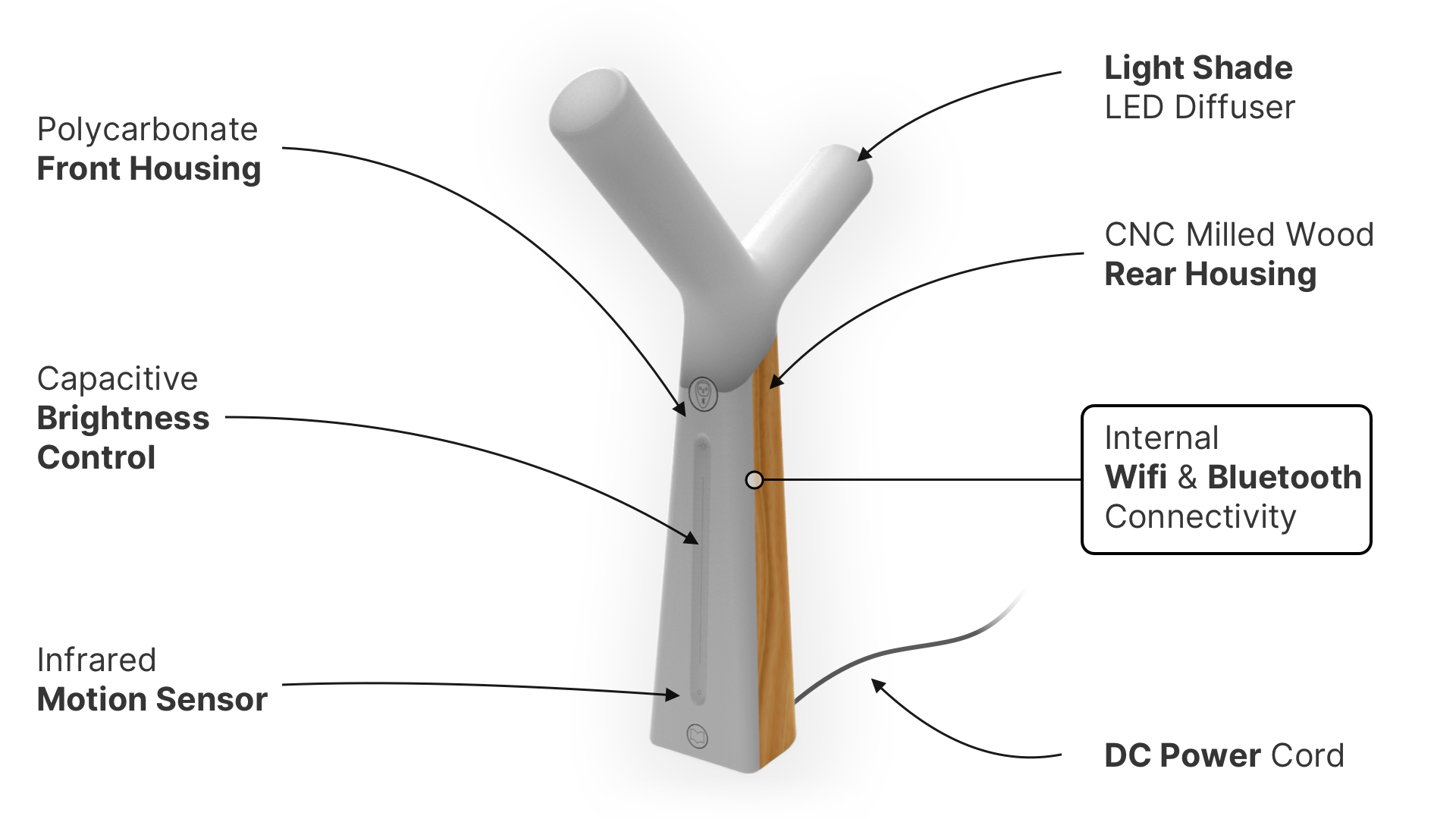 The star of the show, the semi-translucent polycarbonate LED diffuser houses the orange and blue LEDs. An opaque polycarbonate front piece to house electronics, specifically the capacitive controls. The rear housing is made from a single machined wood piece, with a variety of types to choose from to complement any room decoration.