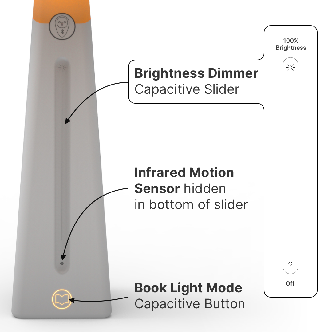 Capacitive controls embedded in the front polycarbonate housing provide quick bedside access to light settings.